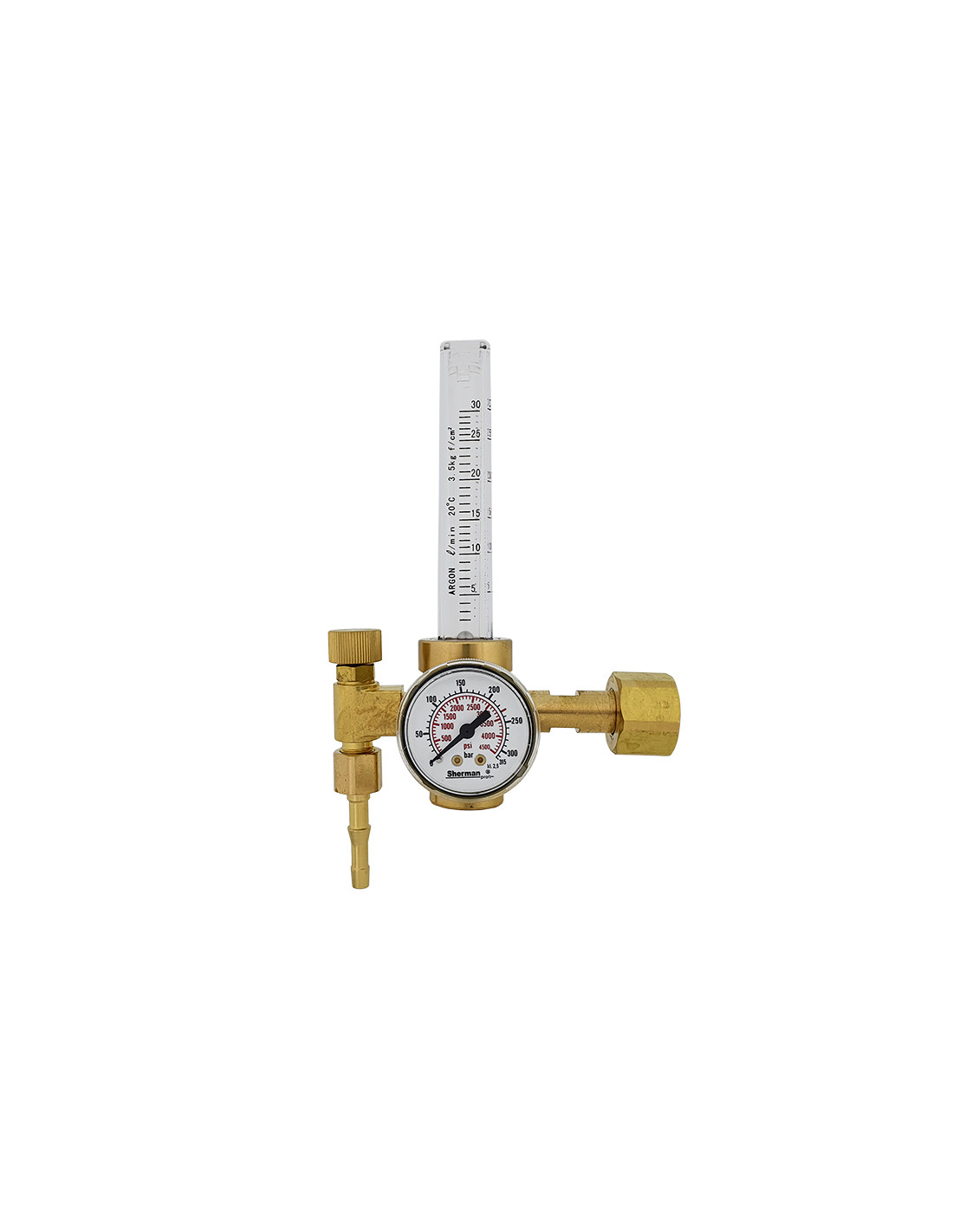 Reduktor jednostopniowy do argonu, mieszanki i dwutlenku węgla z rotametrycznym wskaźnikiem przepływu gazu oraz manometrycznym wskaźnikiem ciśnienia roboczego w butli.