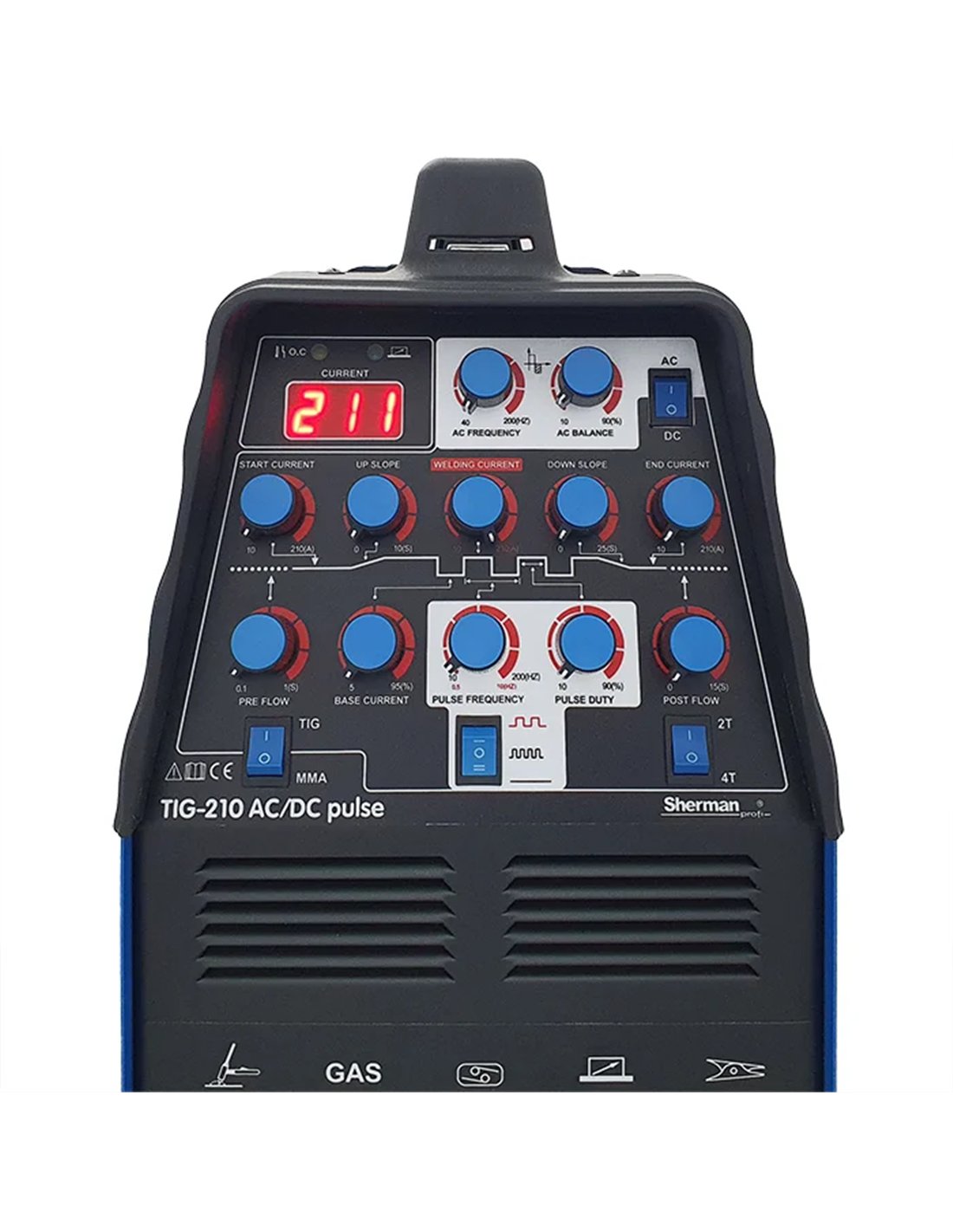 Spawarka TIG 210 AC/DC pulse jest urządzeniem inwertorowym wykonanym w technologii IGBT. Służy do spawania ręcznego prądem stałym oraz przemiennym metodą TIG oraz prądem stałym elektrodą otuloną (metoda MMA).