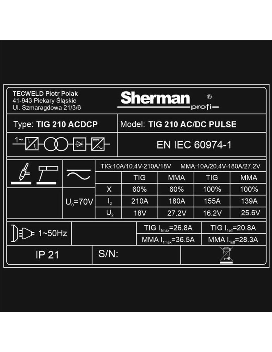 Marka: SHERMAN | Metody spawania: TIG AC/DC, MMA | Zasilanie: 230V | Prąd spawania: 200A | Sprawność: 60%