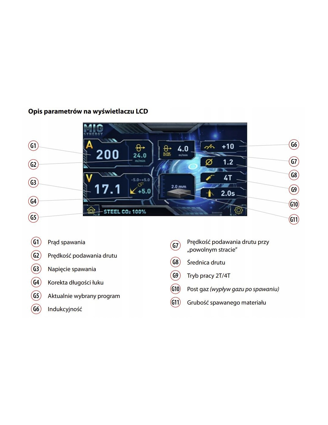 ⚙️ Programy spawania: stal CO₂, stal mieszanka, aluminium, drut proszkowy