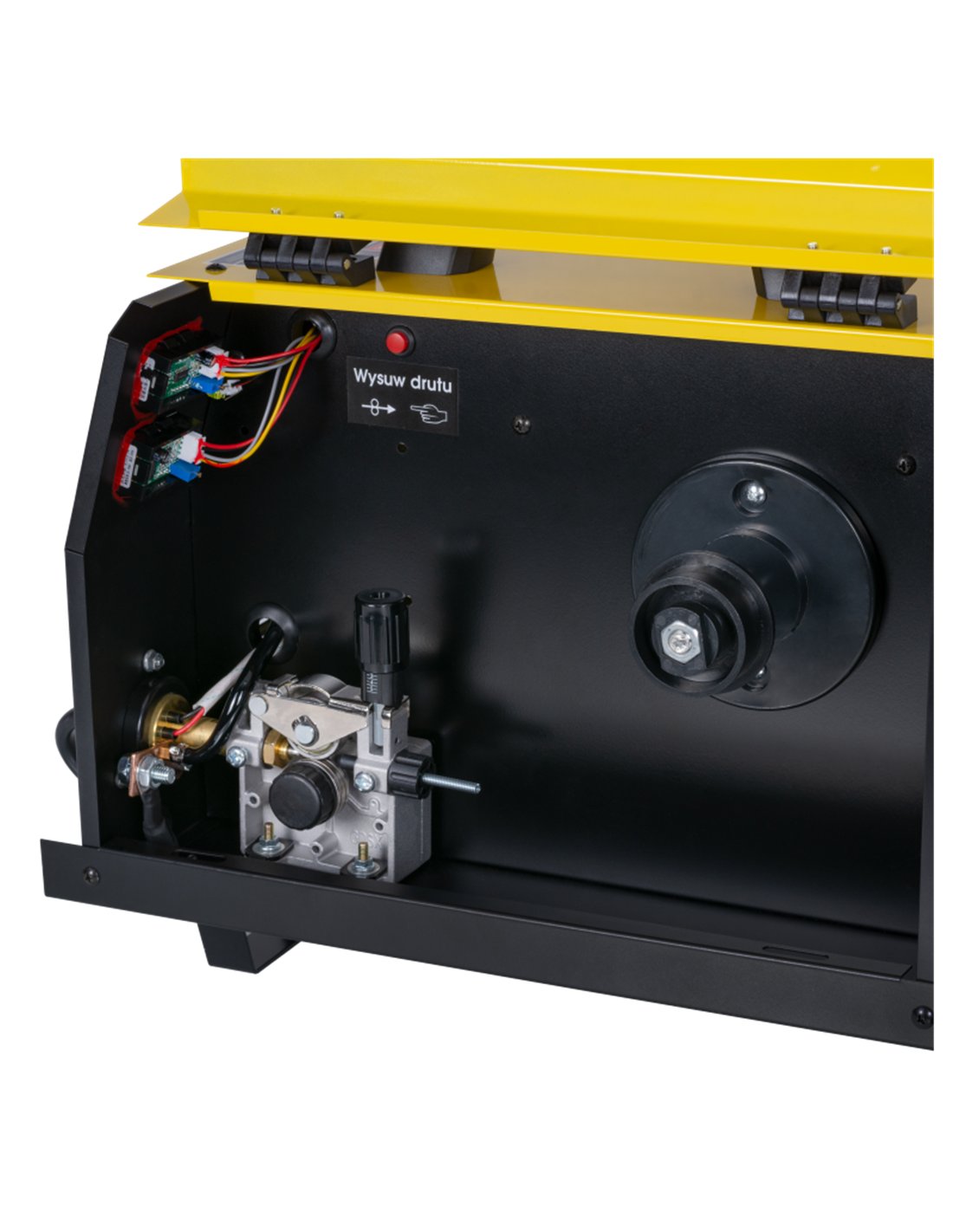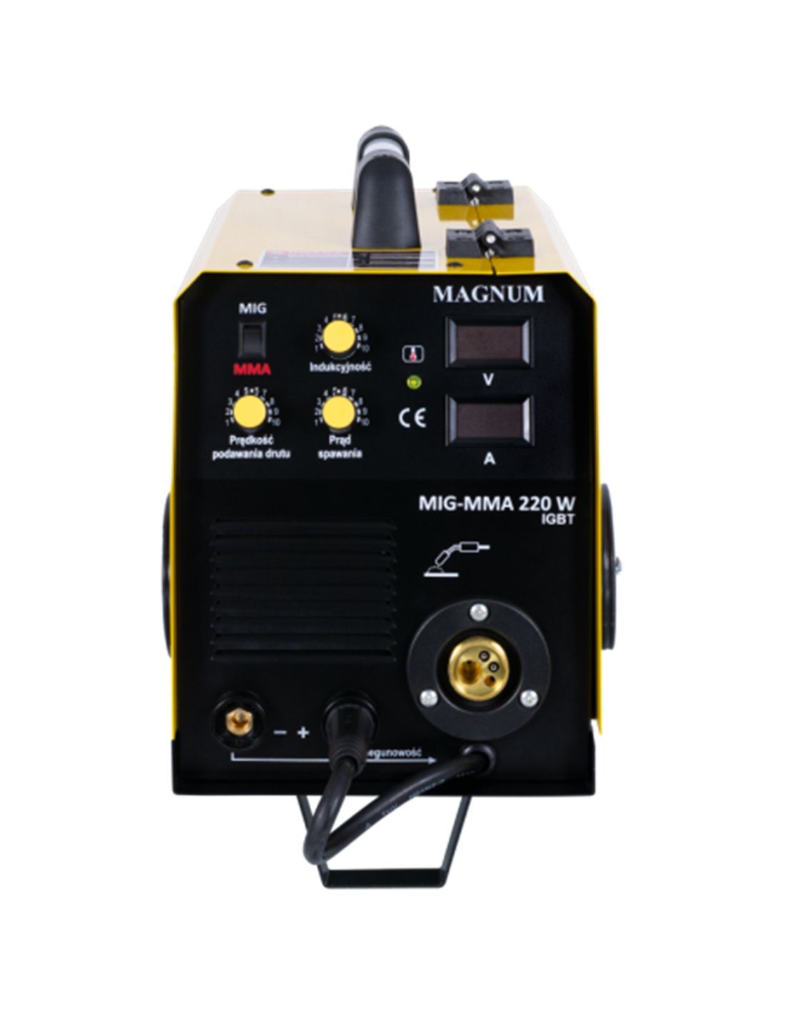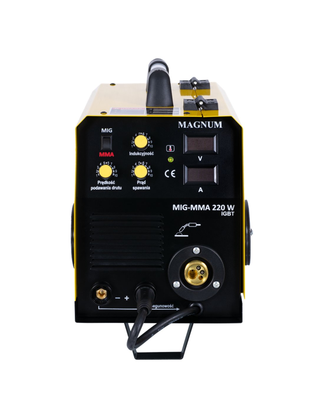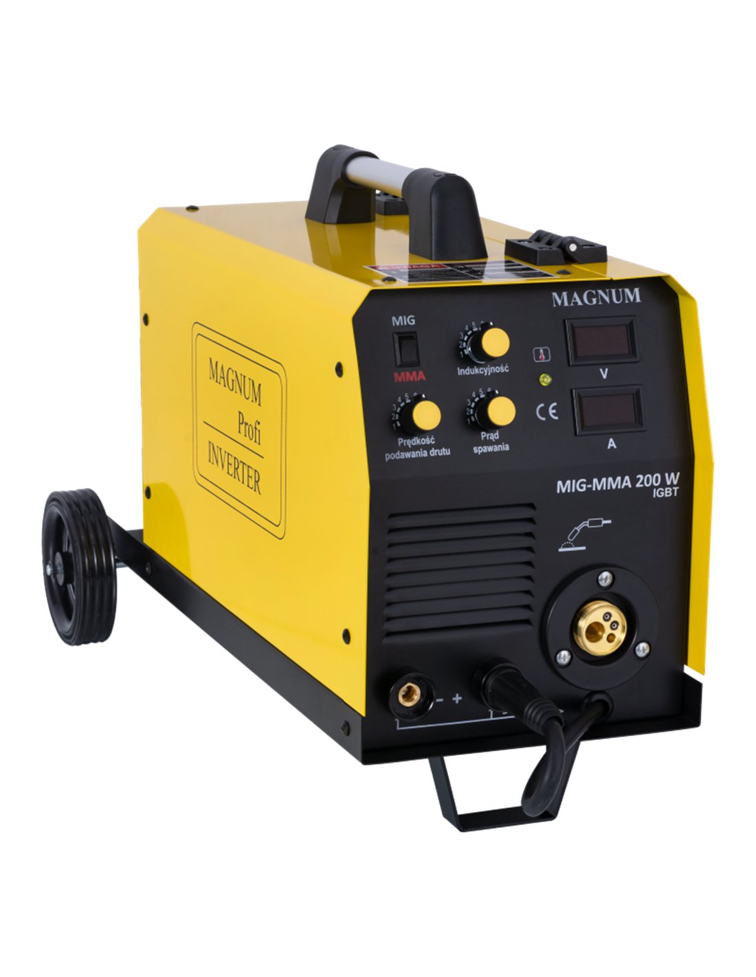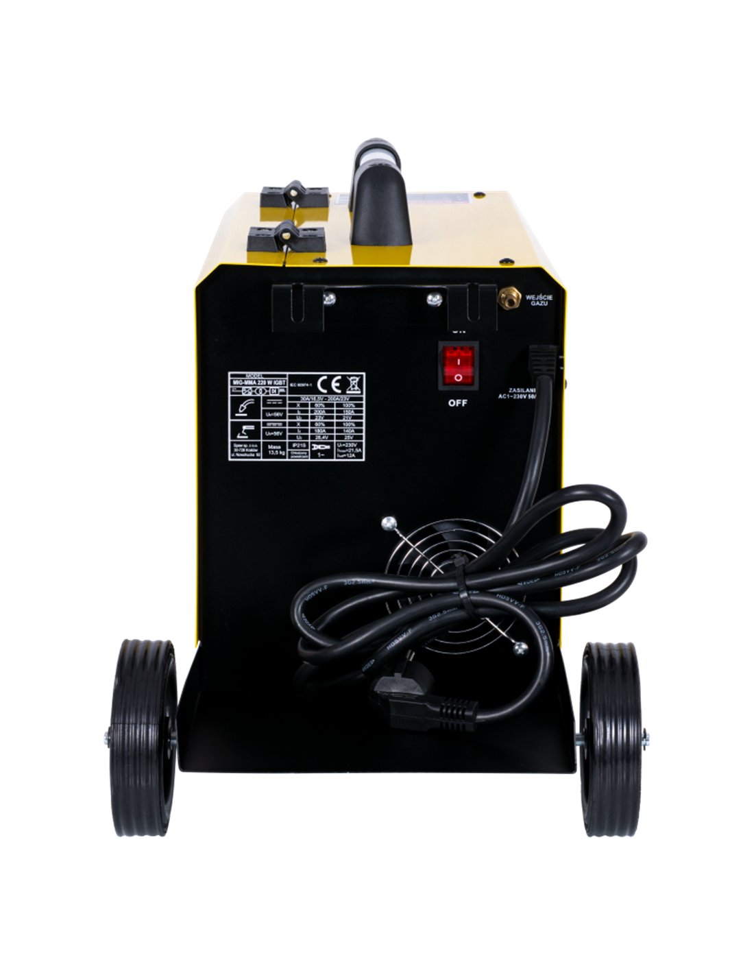 Synergiczny inwertor IGBT, prąd spawania 200A (60%), sterowanie cyfrowe, zasilanie AC 230V 50Hz, MIG, MMA, Lift TIG, puls, podwójny puls.