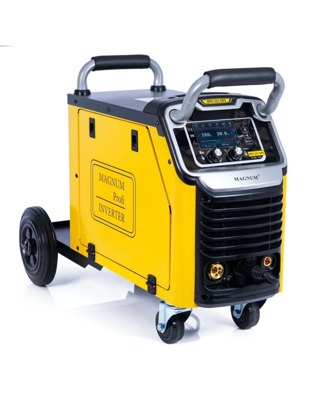 MAGNUM MIG 221 DPS 4X4 w wersji ze szpulą 15 kg to zaawansowane technologicznie urządzenie spawalnicze klasy profesjonalnej. Przeznaczone do pracy w wymagających warunkach przemysłowych i produkcyjnych, zapewnia dużą wydajność i szeroki zakres regulacji parametrów. Cztero-rolkowy podajnik i rozbudowane funkcje sterowania sprawiają, że urządzenie doskonale nadaje się do precyzyjnych i powtarzalnych zadań spawalniczych: