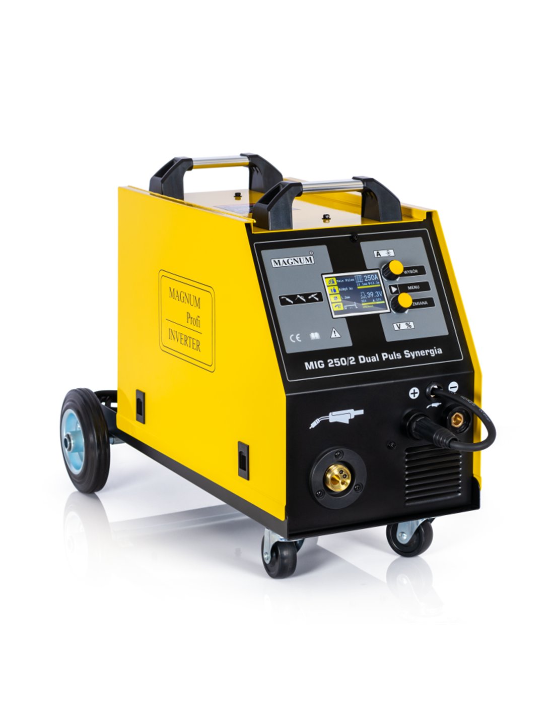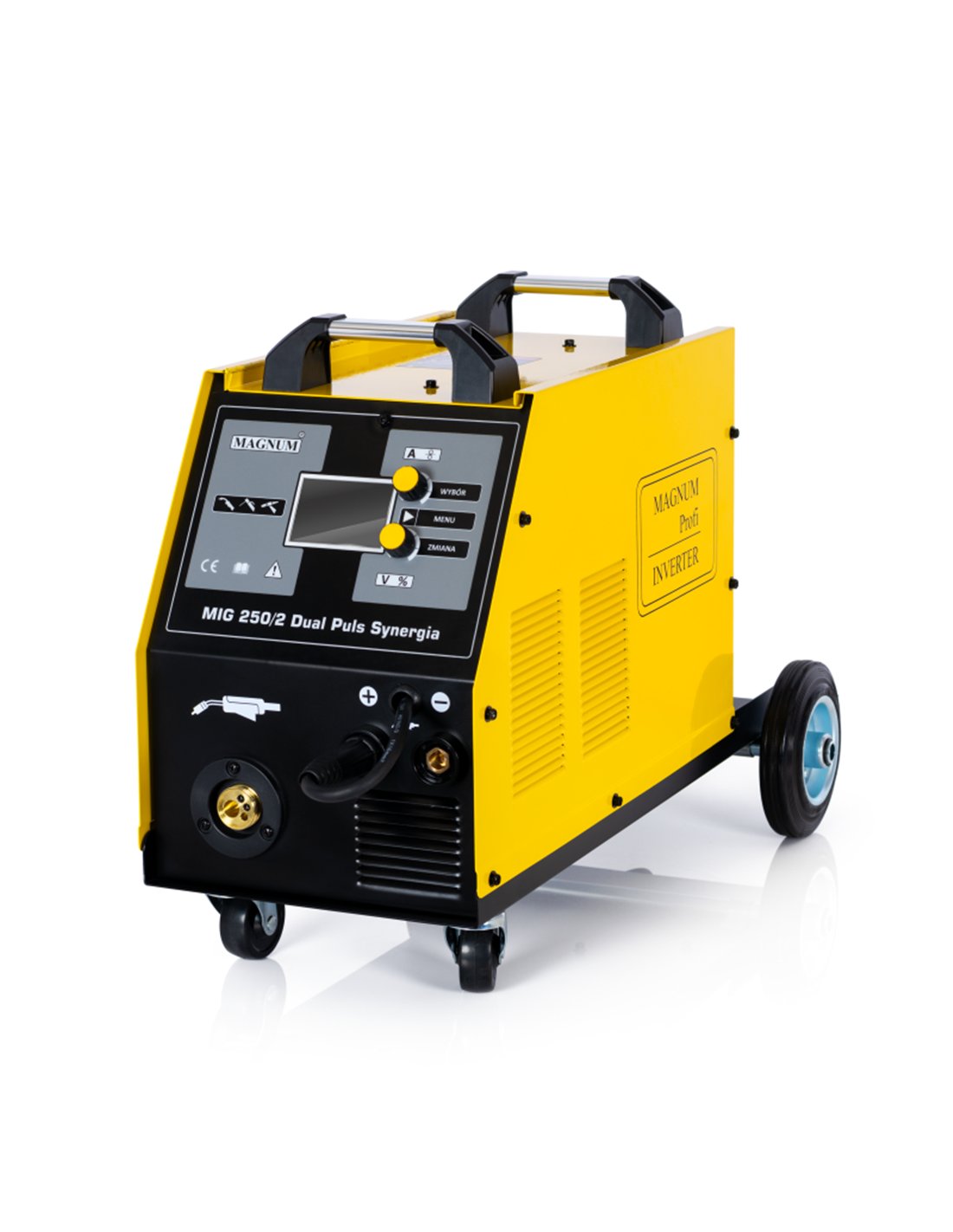 MIG 250/2 Dual Puls Synergia to profesjonalna spawarka dla wymagających użytkowników. Wyposażona w wysokowydajne tranzystory IGBT, źródło prądu zapewnia minimalne zakłócenia elektromagnetyczne i niskie straty mocy. Dzięki temu osiąga się wysoką wydajność przy jednoczesnym zmniejszeniu zużycia energii.